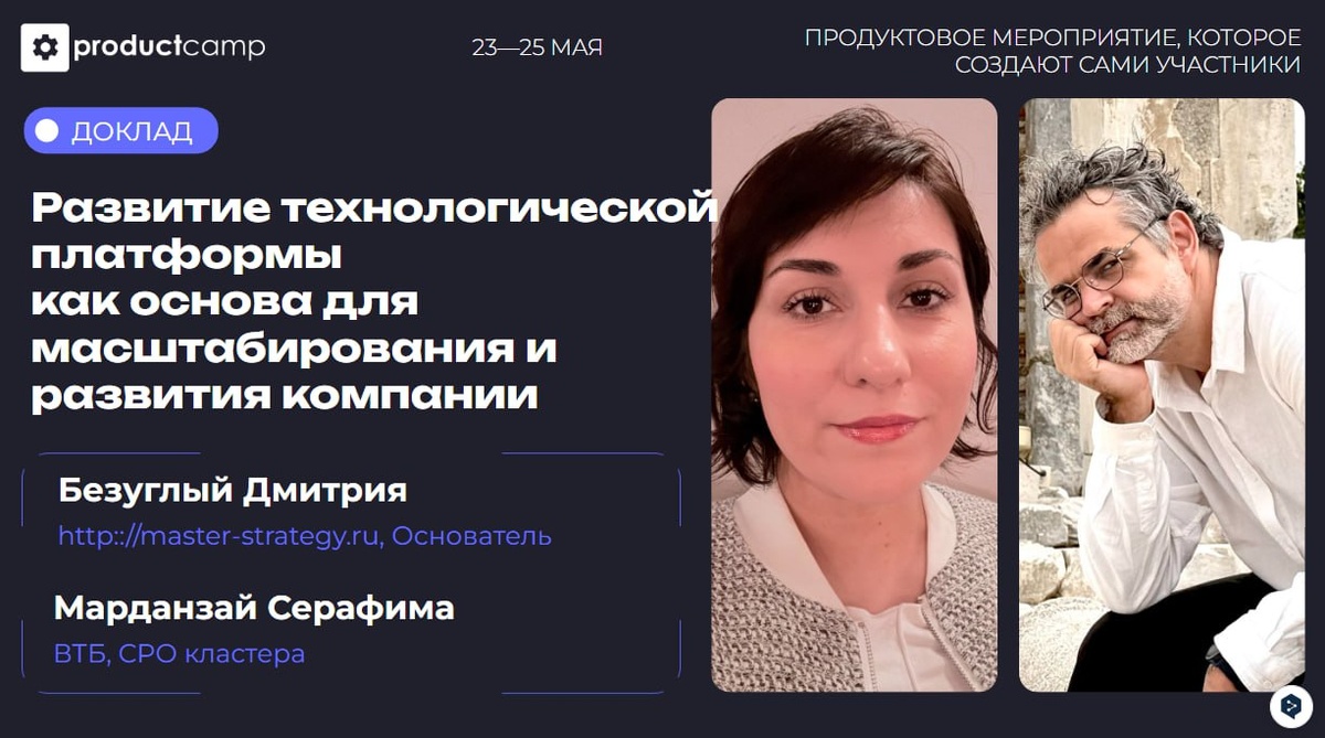 Сегодня есть прекрасная возможность развиртуализироваться для тех, кто будет на ProductCamp’е. Выступаю с докладом “Развитие технологической платформы как основа для масштабирования и развития компании”. Если интересна тема - приходите ) начало в 18-00. P. S. За лучший вопрос ждет мерч от Master strategy 🎁: кружка и футболка. P. P. S. А также напоминаю, что 26 мая начинается Мастерская масштабирования продукта и развития продуктовой команды, и можно ещё успеть заскочить в последний вагон 🚃