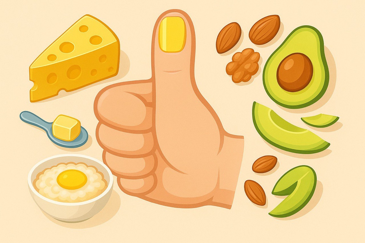 Вы не добавляете жир в тарелку ложками. Но он там всё равно есть. В каше, в сыре, в ложке масла «для пользы» — он накапливается, даже если кажется, что едим «чисто». А потом удивляемся: вес не уходит, кожа капризничает, энергии не хватает. Причина — не в самих жирах, а в их количестве. А считать никто не хочет (и правильно). Чтобы понять, сколько жира вам нужно — посмотрите на большой палец. Первая фаланга большого пальца (та, на которой ноготь). Никаких таблиц. Просто ваш палец — ваш ориентир. Жир нужен — без него ни гормонов, ни мягкой кожи, ни гибких сосудов. Но «в самый раз». Пусть жир работает на вас, а не против вас. Чуть внимания — и уже через пару недель вы почувствуете лёгкость, кожа станет мягче, пищеварение — спокойнее. Подпишитесь, чтобы не пропустить следующий текст В нём — как продукты с омега-6 могут подливать масло в огонь воспаления, и что с этим делать. Всё по делу, без паники — и с заботой.