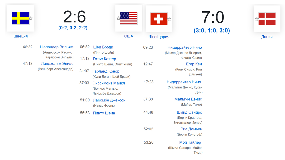 Привет всем любителям хоккея. Определились финалисты чемпионата мира по хоккею 2025. Сборная США в первом полуфинале встречалась с национальной сборной Швецией. Соперники забросили восемь шайб на двоих, а уверенную победу праздновали американские хоккеисты, которые выиграли первый и второй период по 2:0, а третий свели вничью 2:2. На броски Брэди Шея, Каттера Готье, Конора Гарланда, Майкла Эйссимонта, Джексона ЛаКомбе и Шейна Пинто шведы после 46-й минуты смогли ответили голами Вильяма Нюландера и Элиаса Линдхольма. Итоговый счет 6:2. В финал пробилась американская национальная команда, которая за титул сыграет с сильнейшей в паре Швейцария - Дания.