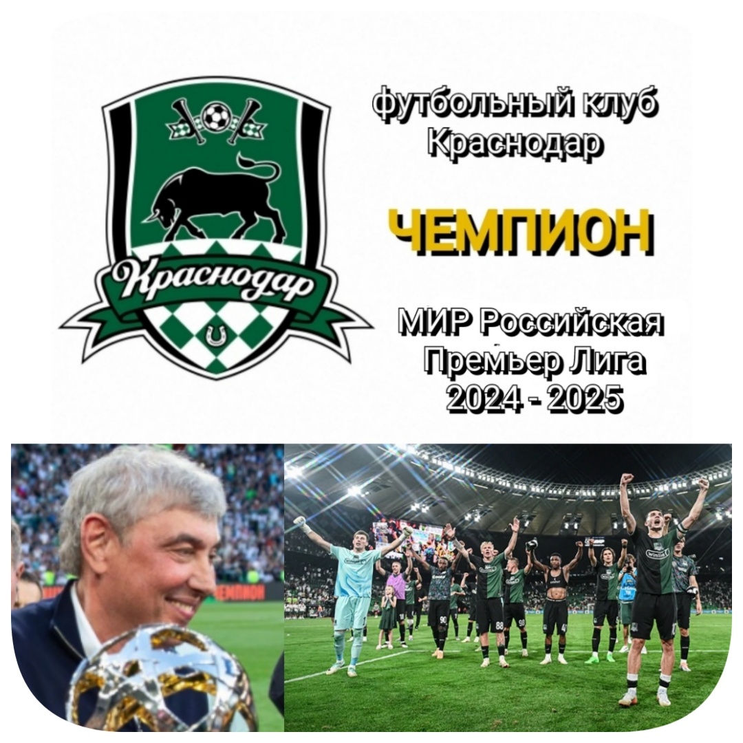 Футбольный клуб Краснодар Чемпион МИР Российская Премьер Лига 2024 - 2025 года Футбольный клуб Краснодар набрав 67 очков за 30 туров МИР Российская Премьер Лига 2024 - 2025 года стал впервые Чемпионом обойдя футбольный клуб Зенит. ювес.рус