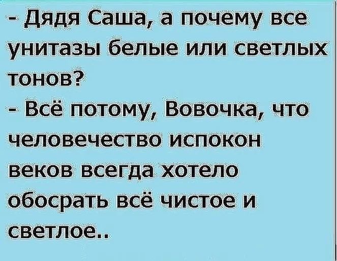 Вовочка говорит: – Мои родители мультиков боятся. Как мультики показывают, они меня к телевизору сажают, а сами залезают под одеяло и трясутся. Штирлиц потерял рацию, и его бил озноб. Озноб был радистом, и без рации ему было тяжело. Приходит класс на уроке зоологии в зоопарк: Учительница: – Дети здесь крокодил отложил свои яйца, как вы думаете почему? Вовочка: – Так старый уже. Не нужны они ему! – Василий Иванович, как правильно: «дирежабель» или «дирежвубель»? – Эх, Петька! Аэросрат! Инциклопию читать надо! Штирлиц: – Кто еще раз назовет начальника штаба свиньей, тот будет прикреплен к его личному сортиру, убирать за ним навоз! Вовочка приходит к соседке: – Тетя Клава, у меня мама заболела и нужно малиновое варенье! – Конечно, конечно, деточка! Куда тебе налить? – Да никуда, я здесь съем. Петька посылает сводку в штаб: «Слева находятся березы, сосны и другие кустарники. Прямо по фронту – кустарники, кустики и другие деревья». Вовочка прибегает к маме. – Мама, а откуда дети берутся?