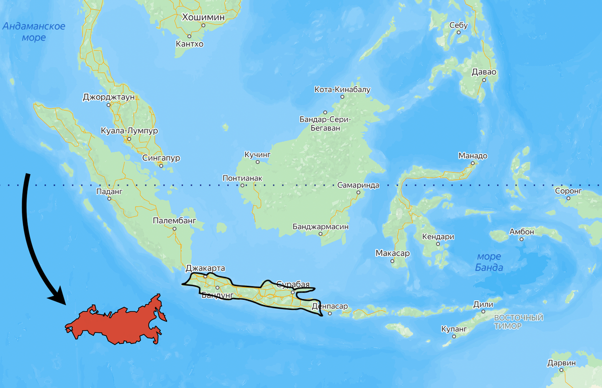 Сравним: вся Россия — свыше 17 миллионов квадратных километров. Население — около 146 миллионов. А остров Ява — всего 132 тысячи квадратных километров.