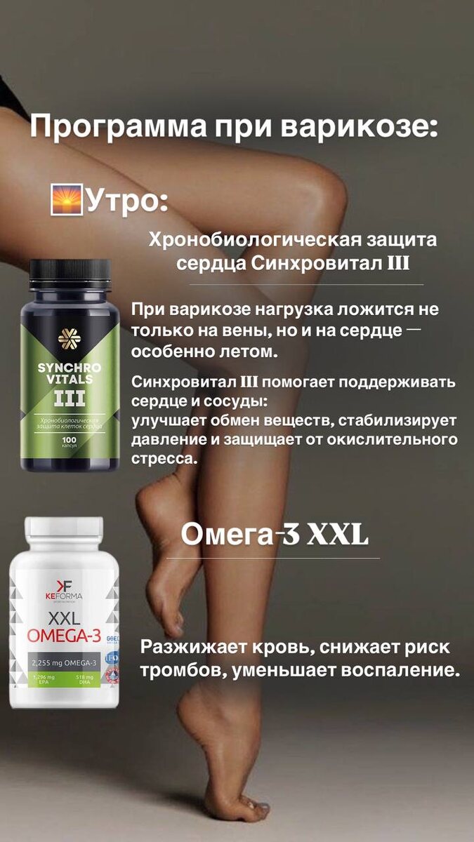 Чем опасен варикоз? Если его игнорировать — могут развиться осложнения: тромбы, воспаление вен, трофические язвы. И всё это не только больно, но и опасно для жизни. Поэтому важно не «терпеть», а начать помогать сосудам — особенно до наступления жары. Рабочая программа поддержки вен (на основе продукции Siberian Wellness) 🗓️👌🏻Курс — минимум 3 месяца для стойкого результата.👇🏻 Утро🌅: 1️⃣Синхровитал III (хронобиологическая защита сердца) При варикозе сердце работает с повышенной нагрузкой — особенно летом. Этот комплекс стабилизирует давление, поддерживает сердце и обмен веществ. ✍️Принимать: утром — 3 капсулы №1, днём — 1 капсула №2. 2️⃣ Омега-3 XXL Разжижает кровь, улучшает её текучесть, снижает риск тромбозов. ✍️Принимать: 2 капсулы в день. ДЕНЬ: 3️⃣Диосмин и рутин Укрепляют венозную стенку, уменьшают отёки, улучшают отток крови. ✍️Принимать: 1 таблетка в день. 4️⃣ Венотоник с диосмином и полифенолами (пряная вишня) Работает на микроциркуляцию и уменьшает воспаление, плюс — пр