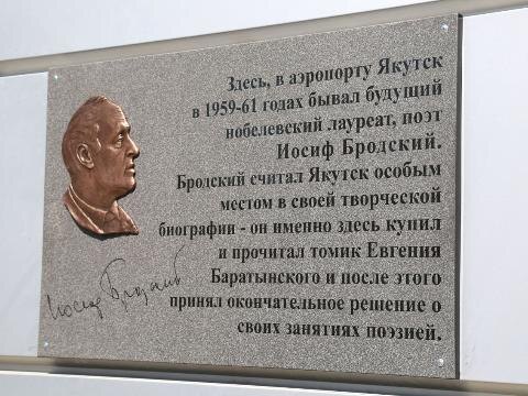 Накануне в аэропорту Якутска внезапно состоялось открытие мемориальной доски поэту, лауреату Нобелевской премии по литературе Иосифу Бродскому. Её открыли в день рождения поэта 24 мая. В этот день ему бы исполнилось 85 лет. Мемориальная доска Бродскому появилась в аэропорту Якутска по инициативе народного поэта Якутии Натальи Харлампьевой и заместителя председателя Государственного собрания (Ил Тумен) Республики Саха (Якутия), председателя Ассамблеи народов Якутии Александра Подголова. Их инициативу поддержал глава Якутии Айсен Николаев, мэр Якутска Евгений Григорьев и генеральный директор аэропорта Якутска Сергей Игнатенко. Увековечить память великого поэта в Якутске решили не случайно. Именно в этом аэропорту будущий нобелевский лауреат провел несколько дней своей жизни в возрасте 19-21 лет, когда работал в геологических экспедициях в Усть-Майском районе Якутии и на юге республики. Сам Иосиф Бродский в своих воспоминаниях рассказывал, что именно во время ожидания рейса он купил в Яку