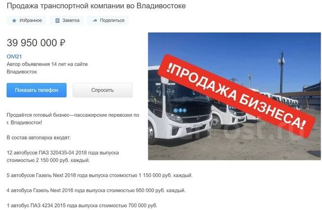Транспортную компанию ООО «Влад Рейс», которая возит пассажиров по 6 маршрутам, продают на «Фарпосте» за 39 миллионов рублей