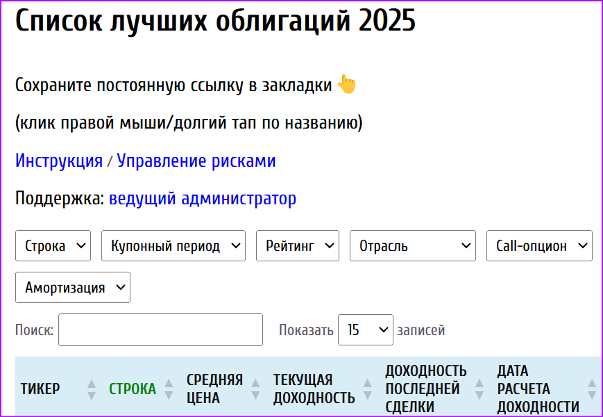 Таблица Список лучших облигаций под управлением ИИ себя вполне зарекомендовала и достаточно хорошо освоена пользователями. Поэтому сегодня речь пойдёт про дополнительные возможности и обратную связь. А тем, кто видит Список впервые пригодится полный мануал: Если тапнуть/кликнуть на тикер откроется карточка облигации В заголовке будет указано название эмитента, тикер, ISIN, ИНН. Обратите внимание, строчки выделенные фиолетовым цветом доступны для копирования в один тап/клик. Сразу за описанием параметров облигации следует абзац со ссылками, он сделан на случай, если пользователь перешел в карточку не из таблицы Список лучших облигаций, а например через поиск Затем следует краткое описание эмитента Все торговые параметры облигаций, необходимые и достаточные для принятия решения есть в таблице Список лучших облигаций. Информация в карточке выпуска носит информационно-вспомогательный характер. А если хочется больше узнать о выпуске либо об эмитенте, можно одним касанием скопировать ISIN ил