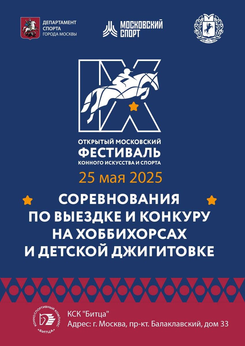 Друзья! Приглашаем вас в третий день IX Открытого Московского фестиваля конного искусства и спорта стать свидетелями ярких соревнований по выездке и конкуру на хоббихорсах, а также увидеть мастерство юных спортсменов в детской джигитовке! Расписание: Хоббихорсинг 10:00 - начало соревнований Детская джигитовка 12:30 - разминка/тестирование 13:30 - ознакомление лошадей с боевым полем 14:00 - начало соревнований 📍Вход свободный