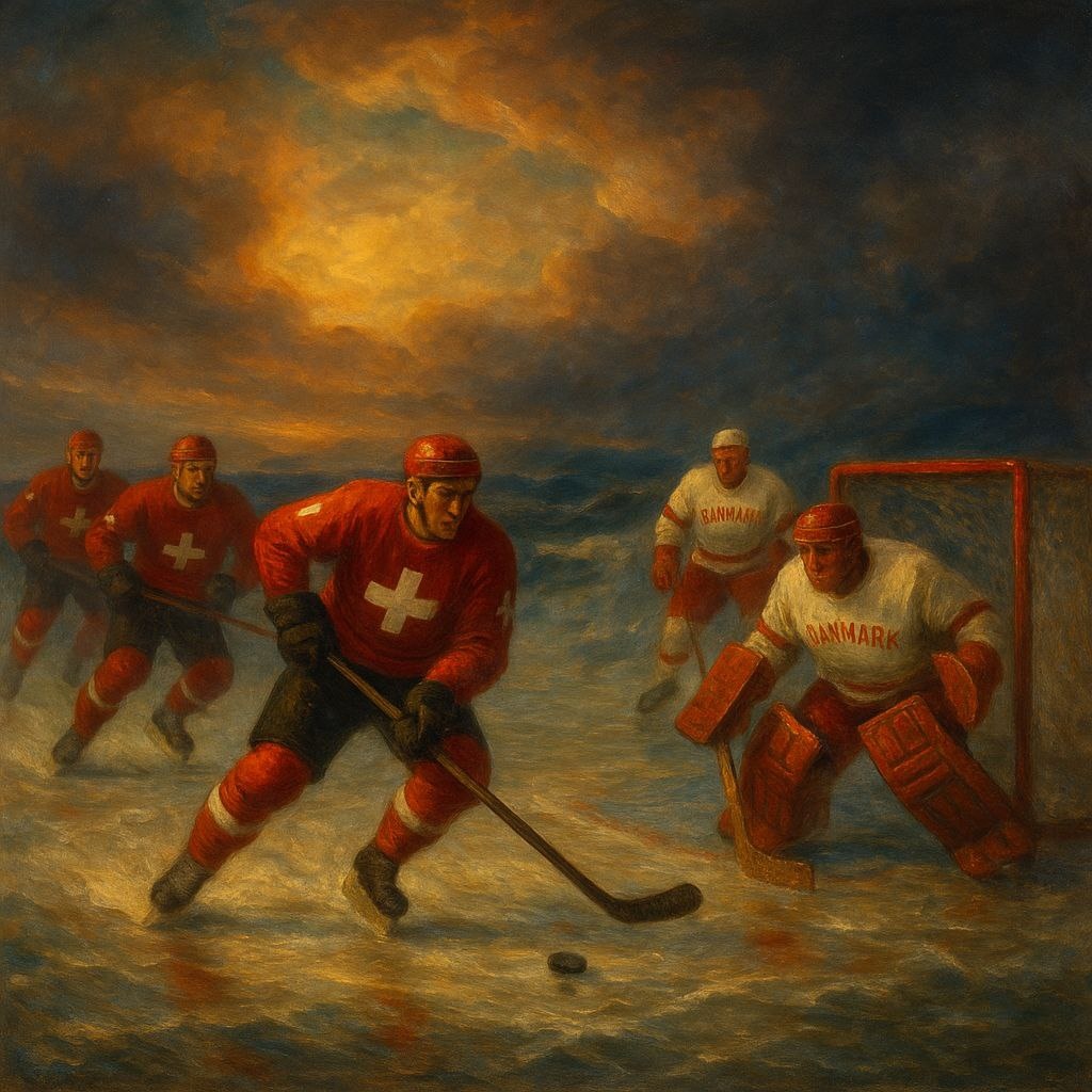 Чуда не произошло - швейцарцы остановили победное шествие датчан Хоккеисты из страны сыра дважды унижали хозяев по ходу турнира - в матче группового этапа 5:2 и в полуфинале особенно больно - 7:0. Сборная Швейцарии лишь в первом матче чемпионата проиграла - в овертайме чехам - и с тех пор довела свою победную серию уже до восьми матчей. В финале Швейцарию ожидает битва со сборной США. В прошлом году швейцарские хоккеисты в решающем матче уступили чешским, до этого в 2013-м и 2018-м шведским. Удастся ли на этот раз красно-белым взять первое хоккейное первенство? В стиле картин Айвазовского.