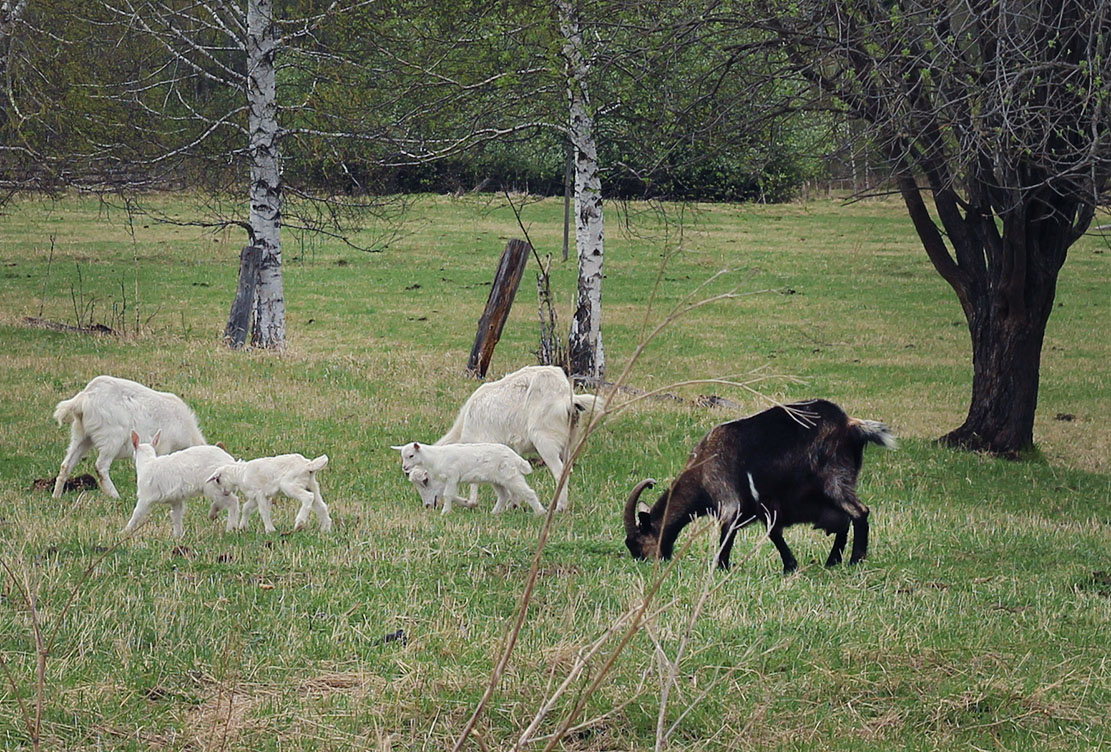 Маленькие козлята - самые веселые на подворье ребята. Повод для оптимизма и прочих раздумий. Пока (безуспешно) пытаюсь продать коз, любуюсь на младшую группу козлят (которым месяц или около того). Практически все обещают быть комолыми, невероятная удача! Очень удачные тонкие рослые девочки. Даже козлик комолый есть. Вот комолых очень жалко на мясо оставлять, да и мяса в них мало, заоненский фенотип не мясной. Хотелось бы их распродать на племя и вырост, однако хорошие козы тут никому не нужны. Козы об этом не знают, они беззаботно бродят по нахоженной годами территории, лакомятся молодой травушкой, прыгают с крыш заброшек, убегают от бычков и ежечасно борятся за власть внутри стада. Младшие козлята пока безрогие, значит у них есть маленький шанс на долгую жизнь. Комолых коз люди любят. Рога начали расти только у нашего домашнего, чтоб его, козлика! Ежедневно вывожу общаться со стадом, чтобы приобщался. Надеюсь после недели снега-дождя и прочих заморозков хотя бы на ночь переводить его