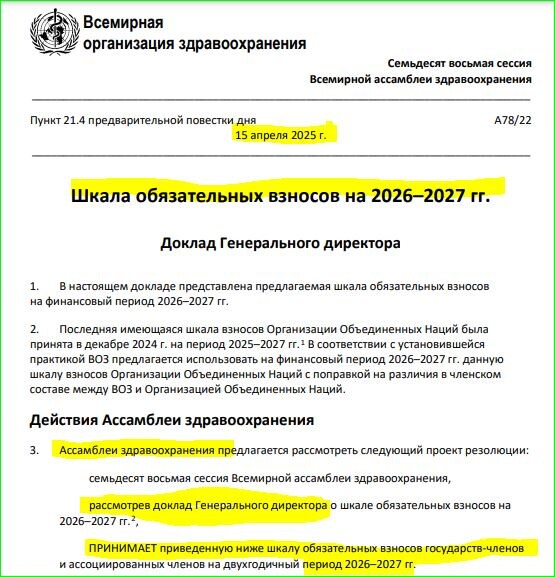 Ежегодный ОБЯЗАТЕЛЬНЫЙ взнос России, согласившейся отстегивать на нужды глобалистов и ЗА который проголосовали ее представители, от имени правительства Мишустина, составляет более 100 млн.долларов из бюджета РФ! https://apps.who.int/gb/ebwha/pdf_files/WHA78/A78_22-ru.pdf