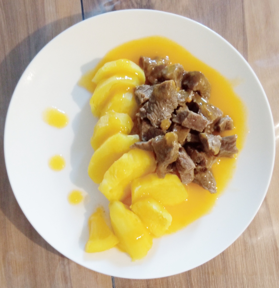 Мандариновый соус один из самых ярких, ароматных и универсальных соусов азиатской кухни, который придает блюдам сладковато-кислый вкус с цитрусовыми нотками. Мандариновый соус чаще всего используют для приготовления мяса, например, говядины, свинины или курицы. Современные повара экспериментируют с мандариновым соусом, добавляя его к морепродуктам, тофу и даже десертам (например, к чизкейку). Благодаря цитрусовым, соус содержит витамин C, кроме того в нем мало сахара, что делает его полезнее многих сладких соусов. Мандариновый соус иногда называют "цитрусовой версией терияки" из-за схожей текстуры и баланса сладкого, кислого и соленого вкусов. Домашний вариант можно сделать за 10–15 минут из свежевыжатого сока мандаринов, сахара, лимона и крахмала для загущения. Для приготовления нам понадобится: Основное блюдо: 400 г Говядины 500 г Картофеля Соус: 300 г мандаринов 1 ч. л лимона 2 ст. л сахара 1 ч. л. Крахмала Соль Говядину необходимо разрезать на небольшие кусочки и отварить на мед