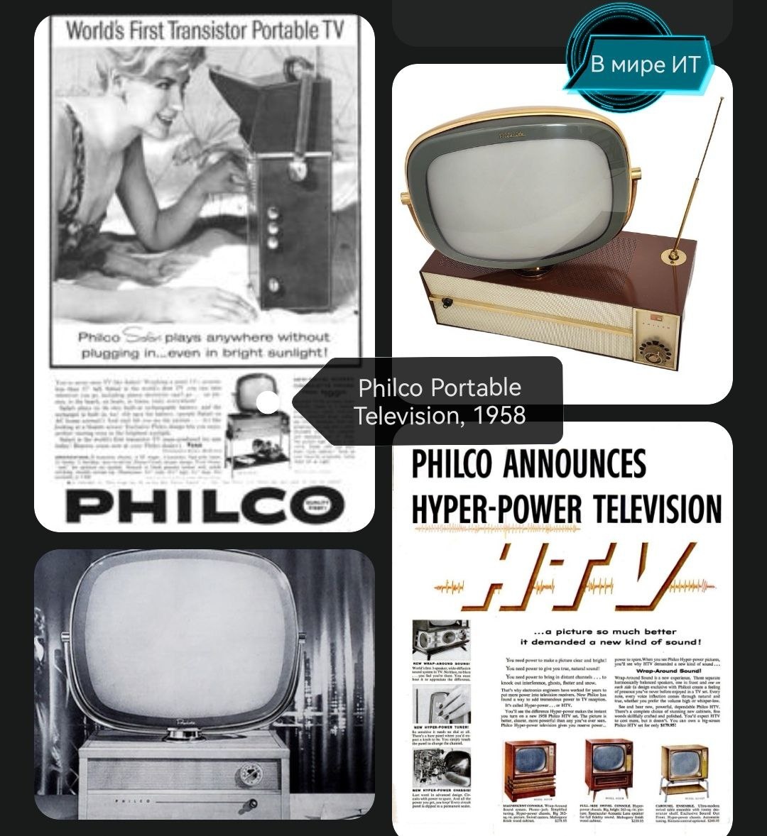 В 1958 году компания Philco выпустила одну из первых портативных телевизионных моделей — Philco Safari. Первый в мире телевизор с батарейным питанием можно было взять с собой на пляж или на стадион. Устройство работало за счёт отражения изображения с маленькой трубки на увеличивающее зеркало, делая его компактным и мобильным. Для продления времени работы от батарей применялись схемы с низким энергопотреблением.