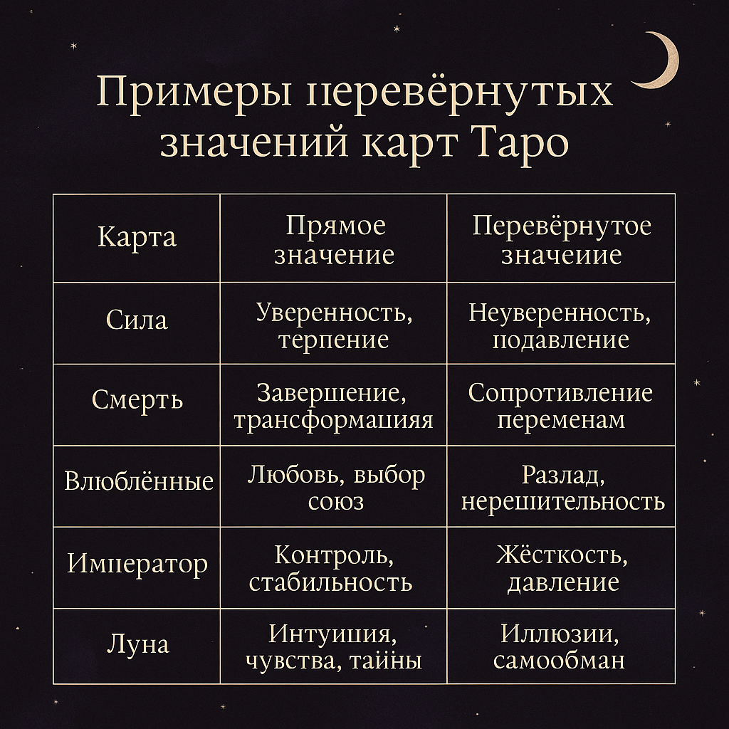 Если ты новичок(ца) — можешь начать без перевёрнутых карт. Но со временем они добавят глубину, нюансы и теневые стороны, которые часто не видны при "прямом" чтении.