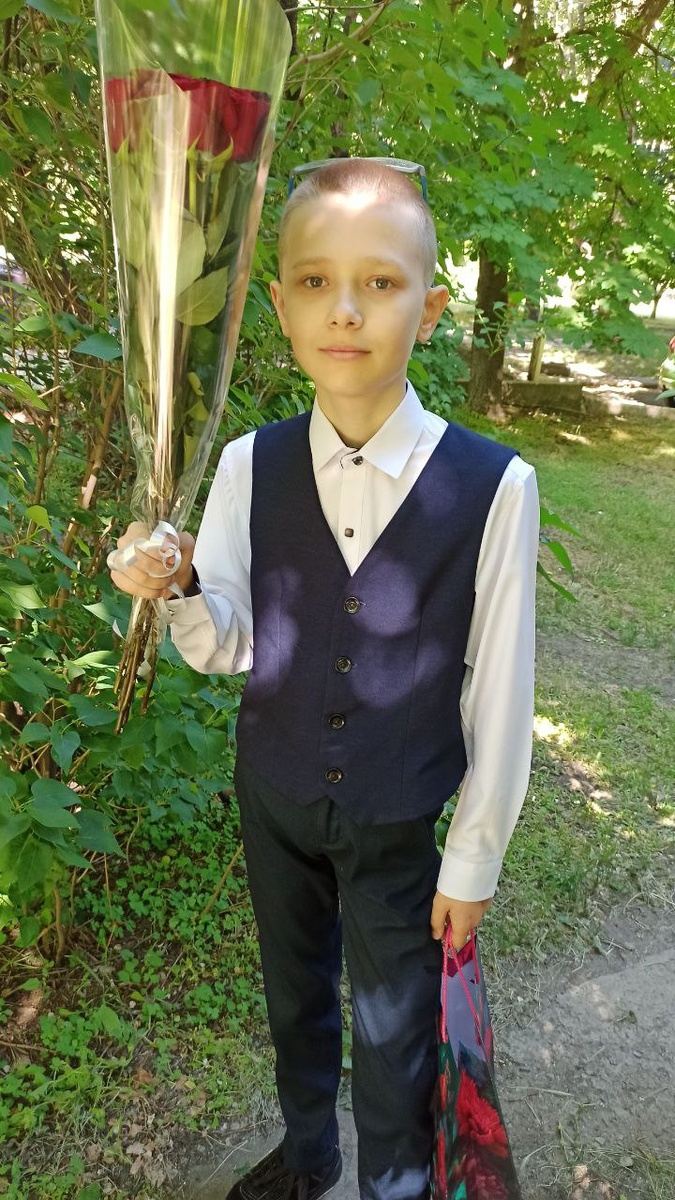 Добрый день мои дорогие друзья , вот и закончился ещё один год учебы и мой внук Женя перешёл в 5 класс. Прозвенел последний звонок в школе, дети попрощались с учителем. И теперь наступили летние каникулы. Дедушки пришли в школу к внуку на линейку. Женя в красивой форме с цветами пришёл поблагодарить учителя для её не лёгкий труд. Теперь он будет учиться в 5 классе.