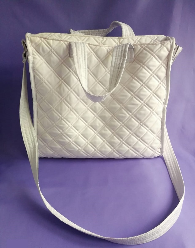 Первое изделие, это вот такая стёганая сумочка-планшет из не промокаемой ткани 100% пэ на молнии, внутри карманы из прозрачной плёнки, сумку можно носить, как в руках, так и на ремне через плечо.