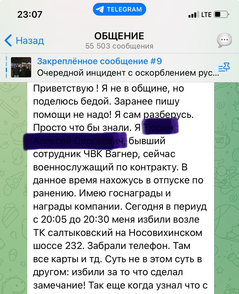 Несколько дней назад в чате «Русской общины» города Балашихи я прочитала обращение бойца - ветерана СВО, находящегося в отпуске по ранению. Ну как обращение? Крик души скорее. Выдержки из этого обращения прикрепляю к данному тексту. Раненого (а потому находящегося в заведомо беспомощном состоянии) бойца избили двое приезжих за сделанное им замечание о том, что они припарковали свою машину на газоне. А дальше - крик отчаяния просто. Боец уже был готов (вероятно, при помощи сослуживцев) решить вопрос незаконным путем и понести за это наказание. Потому как ему было дико, больно и обидно за то, что в тылу ситуация - вот такая, какая она есть. И что отношение к нему - вот такое вот. Мне это, конечно, напомнило ситуацию с моим добрым другом - бойцом Юрием Горенковым, которого в заведомо беспомощном состоянии (Юрий на костылях и в аппарате Илизарова) избил нетрезвый гражданин в сентябре 2024 года. Правда, он был местный, не приезжий. Однако в остальном всё очень похоже. Я связалась с бойцом,