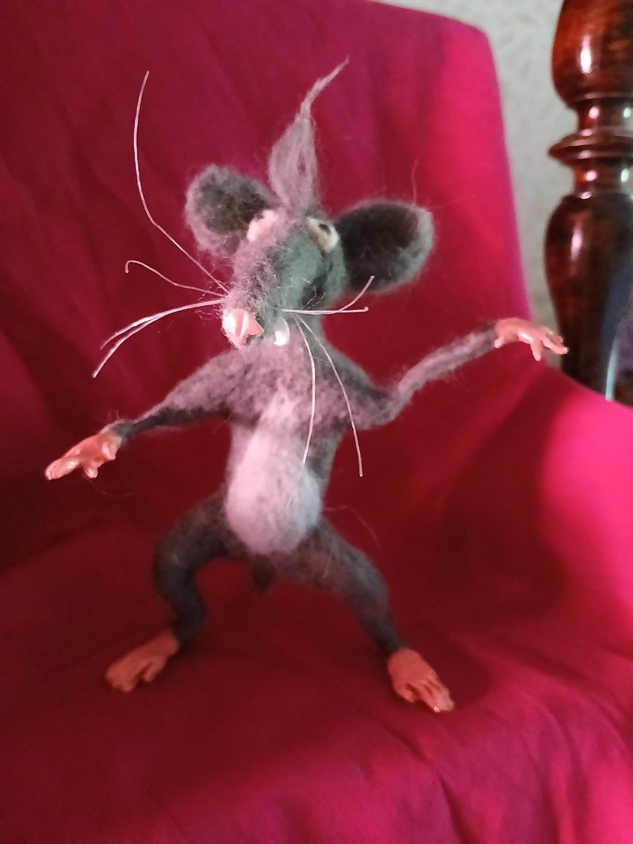 Чуть не забыла написать, что эта фигурка сделана из шерсти, а не из ваты. Носик, лапки и зубы из пластики и покрашены обычным лаком для ногтей. К сожалению, фото получились не очень хорошие но у меня сейчас нет доступа к обычному месту, где я всегда фотографирую фигурки. Ремонт всё не кончается.
