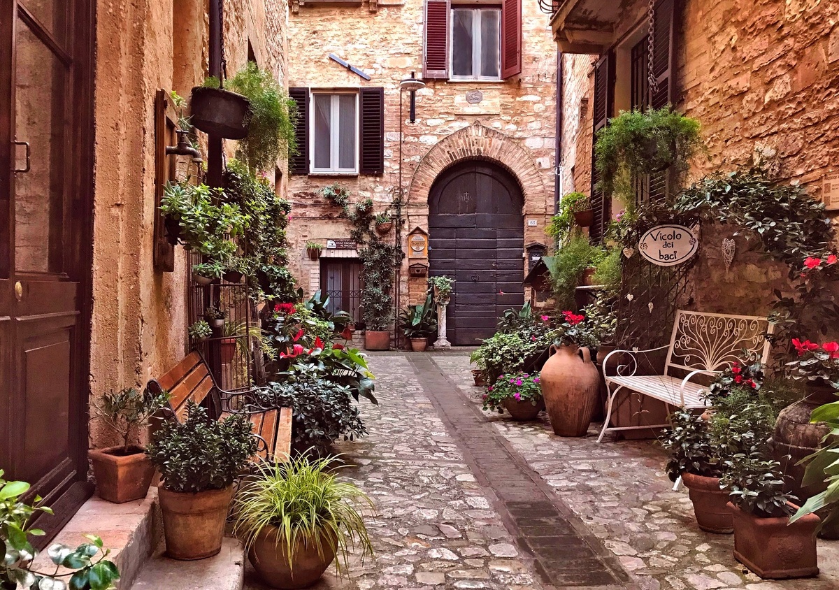 Италия. Историческая деревня Спелло. Красивые улочки, украшенные цветами