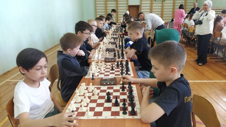 Зур залда ике рәттә балалар тезелешеп утырып, шахмат уйныйлар