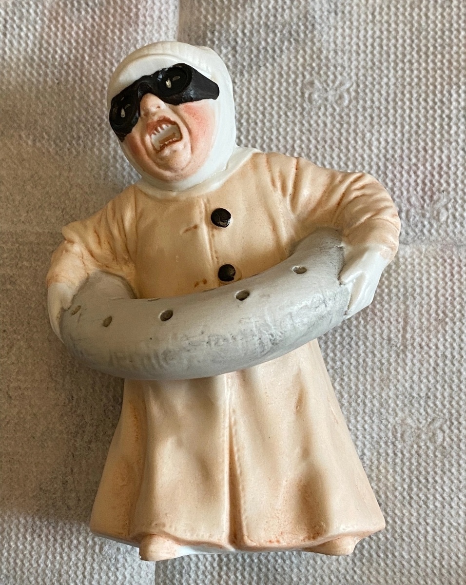 Человека именно в таком снаряжении и демонстрирует нам статуэтка компании Шафер унд Фатер, прославившейся в начале ХХ века своими статуэтками-шаржами, карикатурно изображающими разных персонажей от официанта, до, как мы видим - "шоффэра". Более того, на него надета автомобильная шина. Она белого цвета, ведь сажу в покрышки научились добавлять далеко не сразу. А первые автоколеса были именно белого цвета. В шине отверстия. Скорее всего, предмет задумывался как держатель - подставка для зубочисток. Такие фигурки редки и пользуются большим спросом среди коллекционеров.
