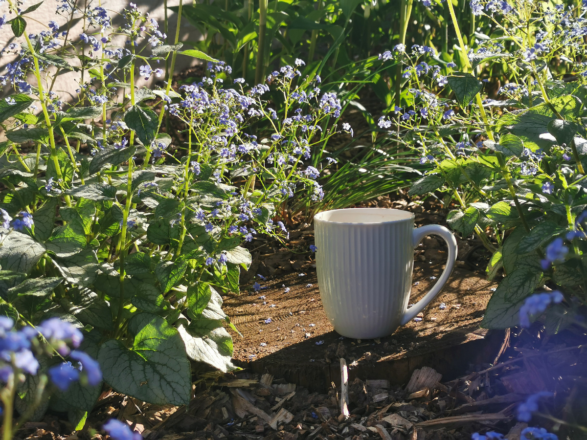 Чашка тоже должна быть яркая! Не только инструмент можно забыть в цветнике