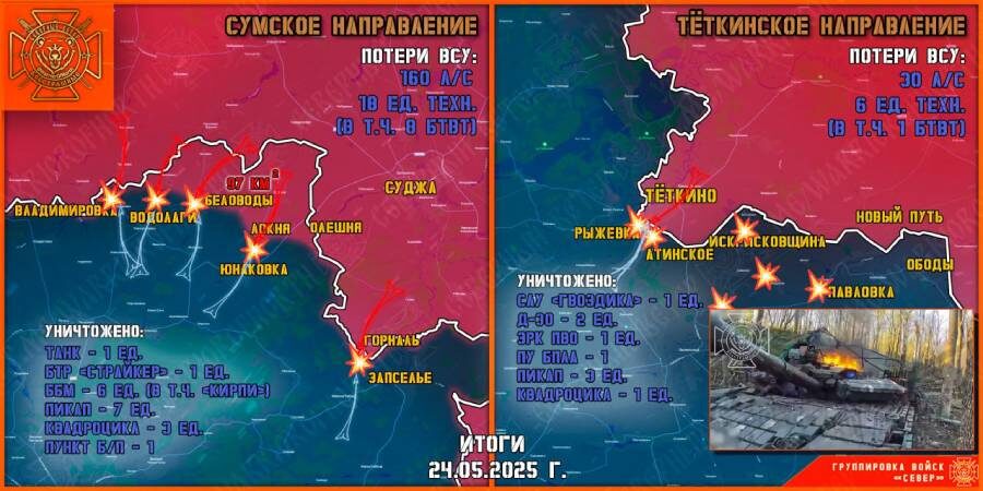 На Теткинском и Глушковском направлениях продолжаются бои. Военнослужащие группировки войск «Север» не допускают прорыва ВСУ на территорию Курской области, создают полосу безопасности рядом с Сумами. Северяне 25 мая опубликовали очередную боевую сводку. «В течение дня огневым поражением попыток проникновения противника на нашу территорию не допущено. В приграничных районах Северяне уничтожали разрозненные группы оккупантов, а также наносили комплексное огневое поражение по скоплению живой силы и технике ВСУ на отдалении от госграницы», — отмечено в телеграм-канале «Северный Ветер». Так, на направлении «Рыжевка — Теткино» операторы БПЛА обнаружили и уничтожили разрозненную группу украинских штурмовиков. «Продолжается систематическое огневое воздействие по скоплениям живой силы и техники противника в Сумской области. За сутки наши операторы барражирующих боеприпасов и FPV уничтожили: пять артиллерийских расчетов, ЗРК ПВО и несколько ПУ БПЛА противника», — добавили российские военные. На