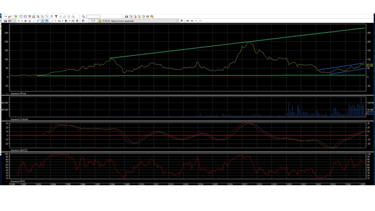 Как видим из обзора новостей, компания Аэрофлот живет и развивается, хотя на дороге развития есть трудности, компания старается их преодолевать. За шесть лет компания Аэрофлот не выплачивала дивиденды акционерам, сейчас появилась слабая надежда, что в начале 2025 она скажет о дивидендах. Дополнительных новостей по дивидендам сейчас нет, но БКС ЭКСПЕРТ дает отрицательный прогноз по движению акции на фондовом рынке. Хотя экономический отчет за первый квартал положительный, все ждут отчета за второй квартал 2025 года. На этой волне сделаем обзор движения акции Аэрофлот с помощью технического анализа до конца июня.