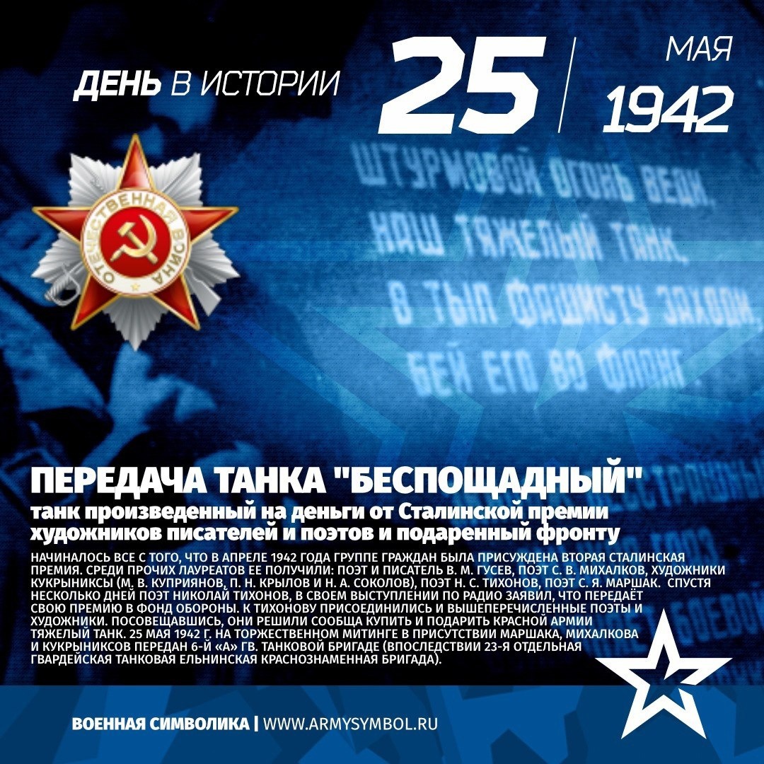 Передача танка «Беспощадный» в войска в 1942 Начиналось все с того, что в апреле 1942 года группе граждан была присуждена вторая Сталинская премия. Среди прочих лауреатов ее получили: поэт и писатель В. М. Гусев, поэт С. В. Михалков, художники Кукрыниксы (М. В. Куприянов, П. Н. Крылов и Н. А. Соколов), поэт Н. С. Тихонов, поэт С. Я. Маршак. Спустя несколько дней поэт Николай Тихонов, в своем выступлении по радио заявил, что передаёт свою премию в Фонд обороны. К Тихонову присоединились и вышеперечисленные поэты и художники. Посовещавшись, они решили сообща купить и подарить Красной Армии тяжелый танк. 25 мая 1942 г. на торжественном митинге в присутствии Маршака, Михалкова и Кукрыниксов передан 6-й «а» гв. танковой бригаде (впоследствии 23-я отдельная гвардейская танковая Ельнинская Краснознаменная бригада). #ПамятныеДатыВоеннойИсторииОтечества #ДеньВИстории #ГодЗащитникаОтечества #80ЛетВеликойПобеды Подпишитесь на наши группы ВКонтакте и в Одноклассниках - читайте, смотрите и комм