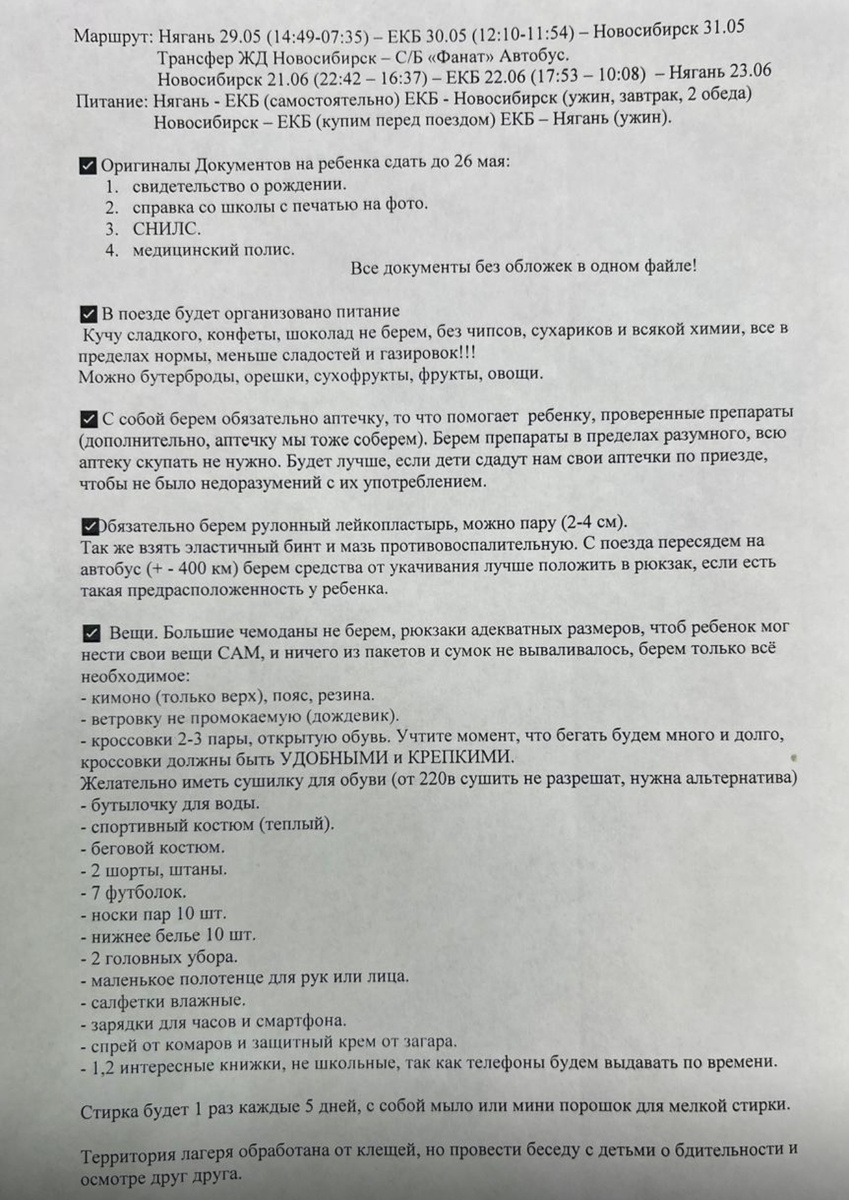Всем доброго воскресного утра! Сегодня я пораньше выхожу, потому что потом будет некогда. Собираю Анатолия на Алтай. Документы тренеру сдали, по списку полностью закупились. И даже всё это беспорядочно в сумку закидали, чтобы лежало оно нужное и важное в одном месте. Вы список видели, какой нам тренеры скинули? Наверное, нет…потому что я его скидывала только в ТГ. Ну вот прикладываю, вдруг кому пригодится для сборов спортивных или просто в лагерь👇👇👇 Ну так вот, всё это добро лежало и ждало резину, которая в очередной раз застряла в Серове, чтобы потом разложиться по пакетикам и закрыться в сумке( сумку взяли Иванову наградную, он великодушно поделился🤝). А в списке фигурировало 3 пары кроссовок… Учитывая прошлый «горный» выезд и позапрошлый…мы поняли очевидную вещь…обувь нужно брать ту, в которой ребёнок уже ходил до этого и чувствовал себя комфортно. Новую брать старого не рекомендуется, потому что, никто не знает, как она себя там поведёт. У нас были очень неприятные прецеден