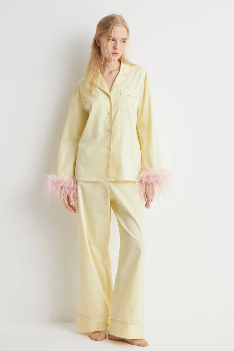 Какие красивые хлопковые пижамы с перьями в LIME обнаружила ❤️🔥 Самое главное проверила, что манжеты с перьями съемные, можно будет спокойно стирать и снимать когда нужно. Я бы ее летом на улицу смело выгуливала с соломенной сумкой и сандалями. И отдельно стилизовала брюки со всем чем угодно, рубашку с шортами или юбками Не могу определиться с цветом, вы за какой? 💛💚