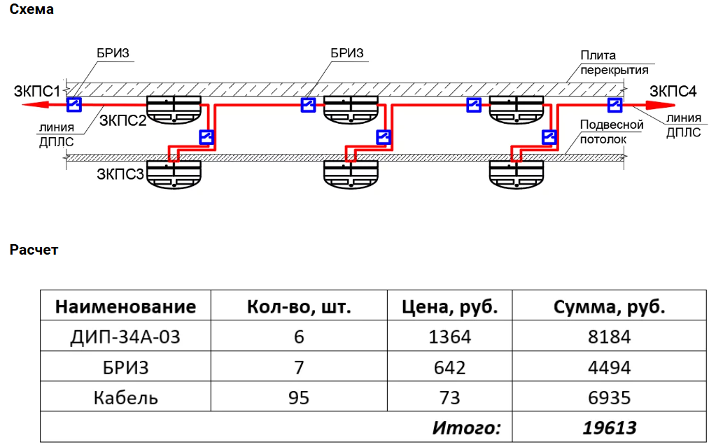 Учебник и курс обучения по слаботочным системам: Рассмотрим различные варианты прокладки кабелей пожарной сигнализации и проведем анализ стоимости применяемого технического решения для следующего примера: длина помещения – 30 м; количество извещателей – 6 шт. Данный вариант прокладки кабеля до введения в действие СП 484.1311500.2020 был самым распространенным. Кабель прокладывался петлей от извещателя за подвесным потолком к извещателю, установленному на подвесном потолке, и далее линия шла к следующей паре извещателей. С введением в действие СП 484.1311500.2020 появилось требование о единичной неисправности линии связи. В линии ДПЛС применяются извещатели без встроенного ИКЗ. Разграничение ЗКПС выполняется при помощи отдельностоящих БРИЗов. При монтаже требуется дополнительно тратить время на установку БРИЗ, выполнять расшивку кабелей не только в извещателях, но и в БРИЗах. При этом БРИЗы – достаточно дорогостоящие элементы, поэтому вариант 1 получается самым дорогим.