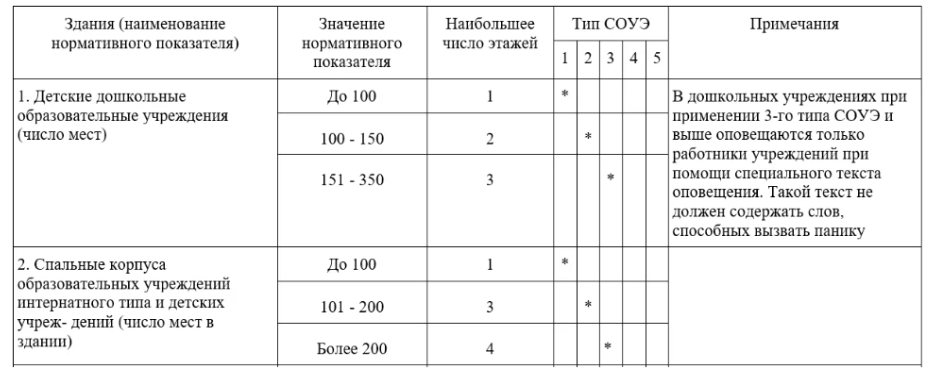 Учебник и курс обучения по слаботочным системам: Для определения типа оповещения необходимо обратиться к СП 3.13130.2009. В таблице 2 СП 3.13130.2009 находим здание (тип здания), которое требуется оснастить системой оповещения, и по значению нормативного показателя определяем тип СОУЭ. При этом не забываем читать примечания, приведенные под таблицей 2.