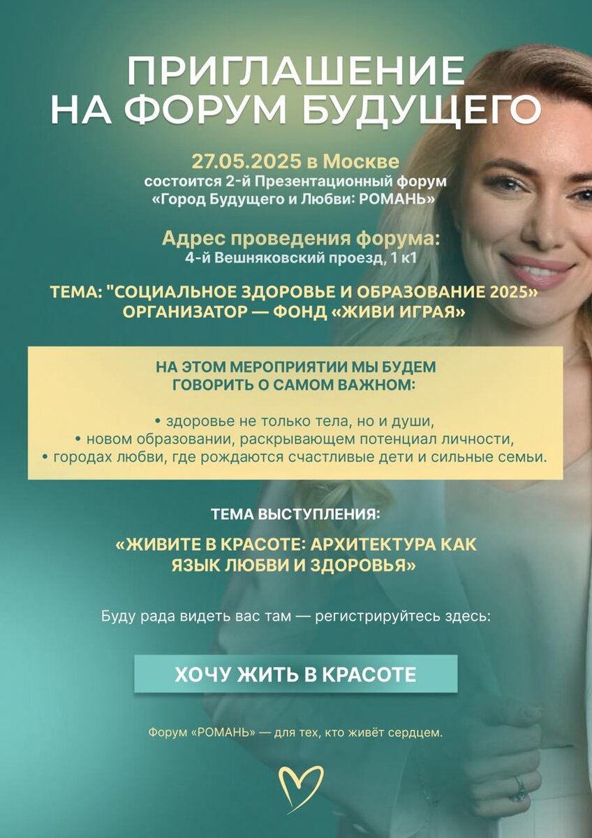 Всем привет 👋 🩷 Хочу пригласить вас совершенно бесплатно на отличный форум, что называется новой волны - про любовь и созидание. ПРИГЛАШЕНИЕ 2-й Презентационный форум "Город Будущего и Любви: РОМАНЬ" 27 мая, вторник, 2025 | Москва | Центр НКО ЮВАО Адрес: г. Москва, 4-й Вешняковский проезд, д. 1, к. 1 (м. Рязанский проспект). Участие бесплатное, но надо зарегистрироваться:👉 https://mnlp.cc/mini?domain=yuliannabelous&id=3 Тема форума: «Социальное здоровье и образование 2025» Вас ждёт вдохновляющее событие с премьерами реалити-сериала, выступлениями лидеров нового времени, мощным нетворкингом и панельной дискуссией. Программа форума:👇 ✔️11:30–12:30 — Welcome-зона, регистрация ✔️12:30–12:40 — Приветственное слово от Анатолия и ЮлиАнны Белоус ✔️Я буду выступать в первой части форума 12:45–15:20 с темой: «Живите в красоте: архитектура как язык любви» 20:15–20:30 — Закрытие форума Регистрация обязательна:👉 https://mnlp.cc/mini?domain=yuliannabelous&id=3 Дресс-код: Белое или св