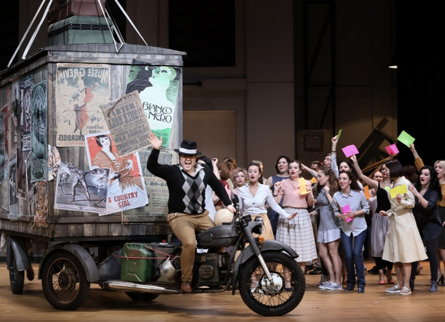 Театр в третий раз обратился к классике музыкального веризма. На заре туманной юности «Паяцев» ставил худрук Дмитрий Бертман, позже — тогда только начинавший Константин Балакин (ныне работающий в Астрахани). Теперь их воплотил победитель конкурса режиссеров «Нано-опера» Дмитрий Белянушкин, в последние сезоны с успехом проявивший себя на столичных и провинциальных площадках. Для весьма популярного произведения он попытался предложить оригинальное решение, но, похоже, не смог довести задуманное до логического завершения. Опера о закулисных страстях в мире комедиантов, где хватает любви, предательства и отчаяния, низости и самопожертвования, — одна из самых театральных музыкальных историй. И хотя она имеет жесткую привязку ко времени и месту — либретто основано на реальном уголовном случае из жизни калабрийских бродячих артистов, который в качестве судьи разбирал отец композитора, — сюжет вечен и понятен применительно к любой эпохе и точке земного шара. Разыграть «Паяцев» можно, пожалуй,