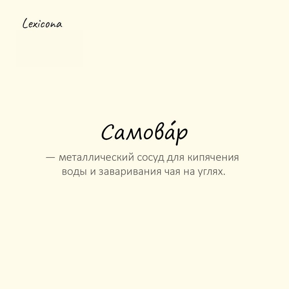 Самовар — металлический сосуд для кипячения воды и заваривания чая на углях Пример употребления: Гости собрались вокруг самова́ра, пили чай с вареньем.