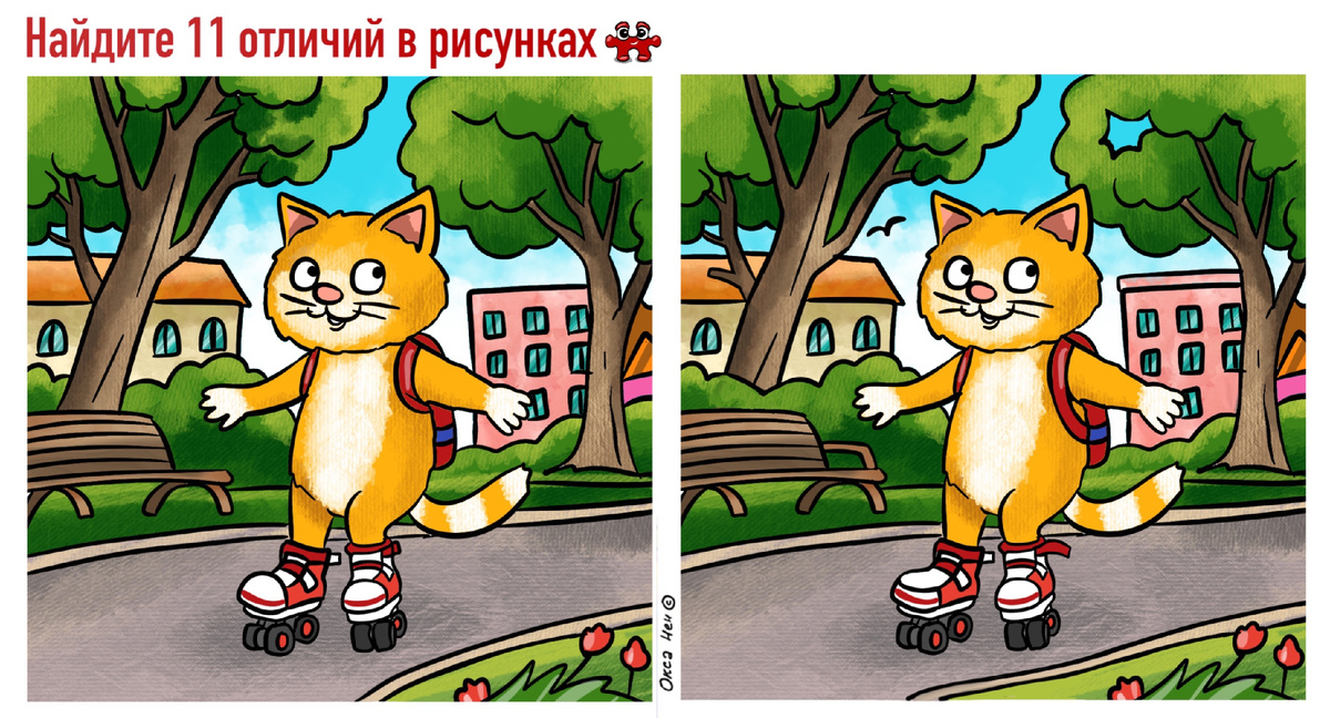 Чем заняться в выходные? Мои дети в один голос сказали бы - кататься на роликах! Вот и наш Кеша Вездекот тоже решил заняться спортом :) А для нас полезная разминка - найти все 11 отличий на этих картинках! Горизонтальная картинка: Вертикальная картинка: Ответ: