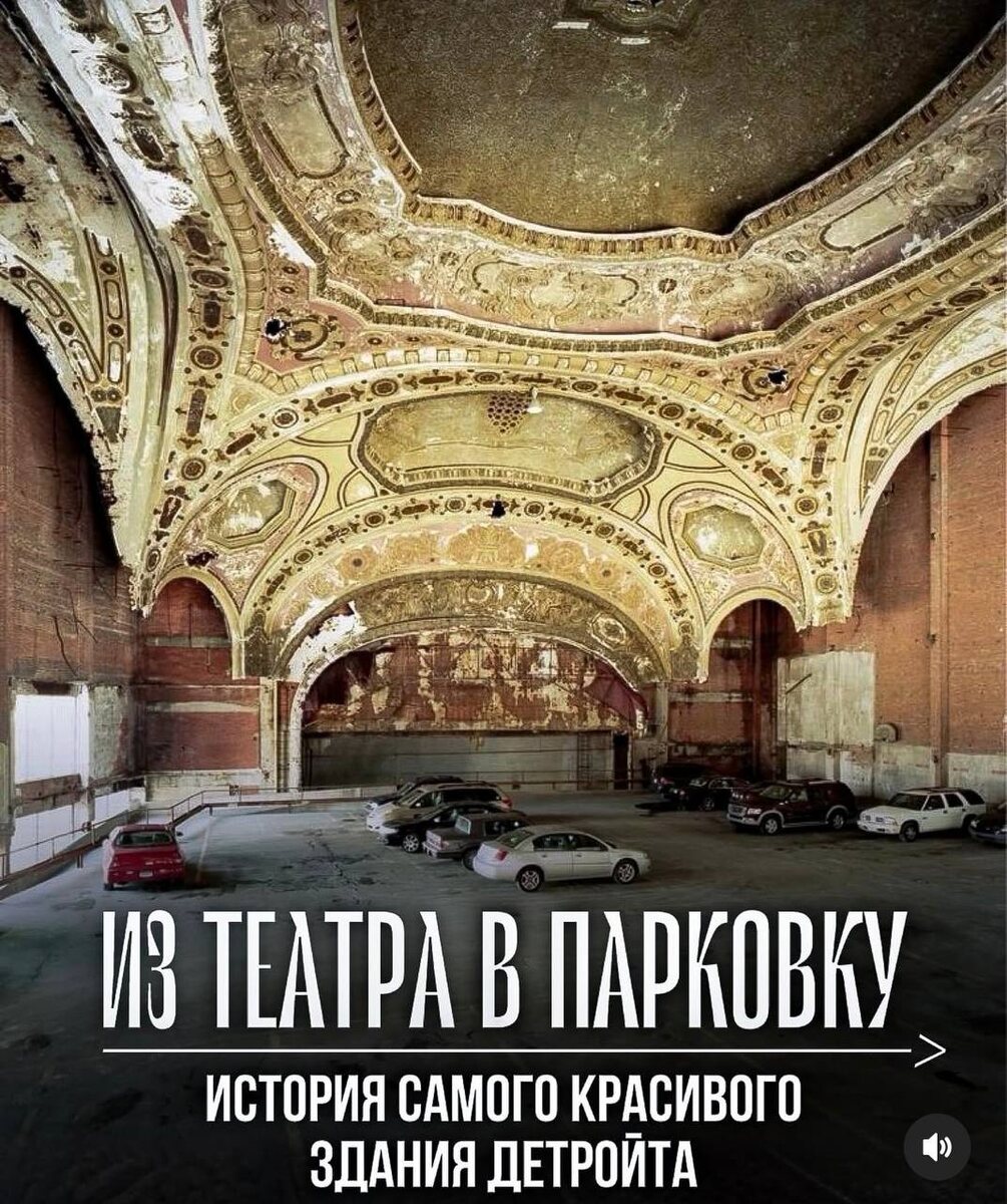 Из театра в парковку... Это Мичиганский театр в Детройте, построенный в 1926 году на заре пика развития автомобильной столицы США. Он считался чуть ли не самым красивым во всей стране - здесь регулярно проходили крутейшие джазовые концерты и кинопоказы. Но после начала детройтского кризиса, театр был вынужден закрыться (так как в 1970-х годах почти всё богатое население штата переехало в соседний Чикаго или Нью-Йорк). Сам же театр закрывать и сносить не стали, и новые владельцы открыли тут парковку, которая работает по сей день. _ Добавлю от себя… мне как специалисту монументального искусства на это тяжело смотреть. В таком состоянии все держать😭