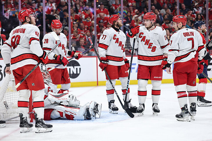 Теперь Бобровский – в шаге от финала. Прижатая к стенке двумя домашними поражениями «Каролина» ехала в гости к «Флориде», чтобыпобеждать. Вместо этого – поражение 2:6 и риск очередного свипа в полуфинале. Одними из главных «творцов» результата стали российские защитники «Харрикейнс» – Александр Никишин и Дмитрий Орлов. Загибайте пальцы: ● первая шайба – неудачный выброс шайбы Никишиным из зоны привел к голу Нико Микколы об Орлова: ● вторая – Орлов сыграл роль фишки для Йеспера Боквиста; ● четвертая – Орлов подарил шайбу Мэттью Ткачаку, и через 5 секунд Александр Барков прошил Петра Кочеткова: И это только те ошибки, которые привели к голам – а «Флорида» воспользовалась не всеми. Во втором периоде Шейн Гостисбеер не смог опустить шайбу на клюшку себе, а не игроку «Флориды» – после этого Орлова превратил в фишку Ткачак, но спас Кочетков. В качестве грустной «компенсации» – третий гол «Флорида» забила без непосредственной ошибки наших защитников, но в их присутствии. Хотя, возможно, Орлов