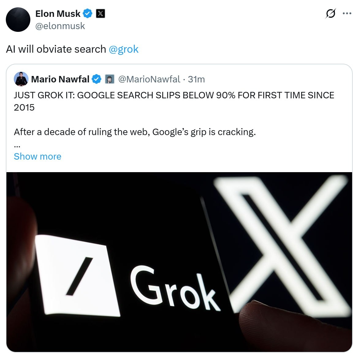 Grok muscling in on Google territory Engine’s share of web searches drops below 90% for first time in over a decade Musk believes ‘AI will obviate search’ - but do you trust AI to direct you to the truth? #Grok #Google