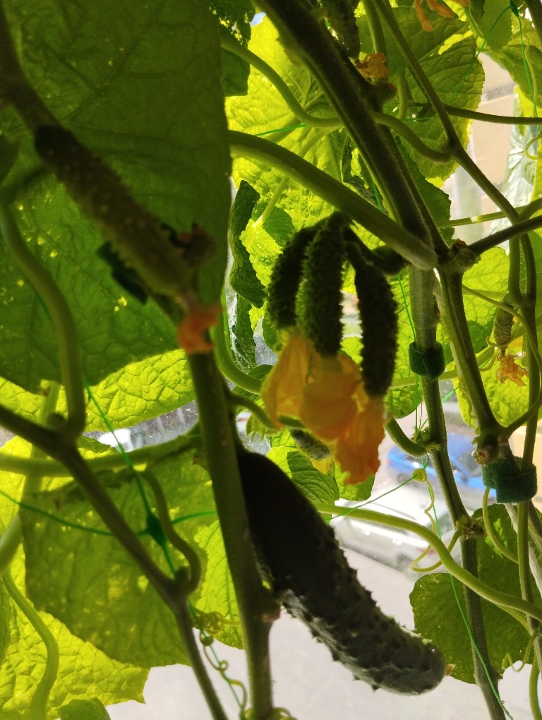 Я дособирала обещанный мужу килограмм огурцов. Урожай уже больше килограмма и они продолжают расти. Но выглядят не очень без нижних листьев. Я купила кронштейны и проволоку, чтобы сделать им опору дальше от стекла, надо будет заняться.