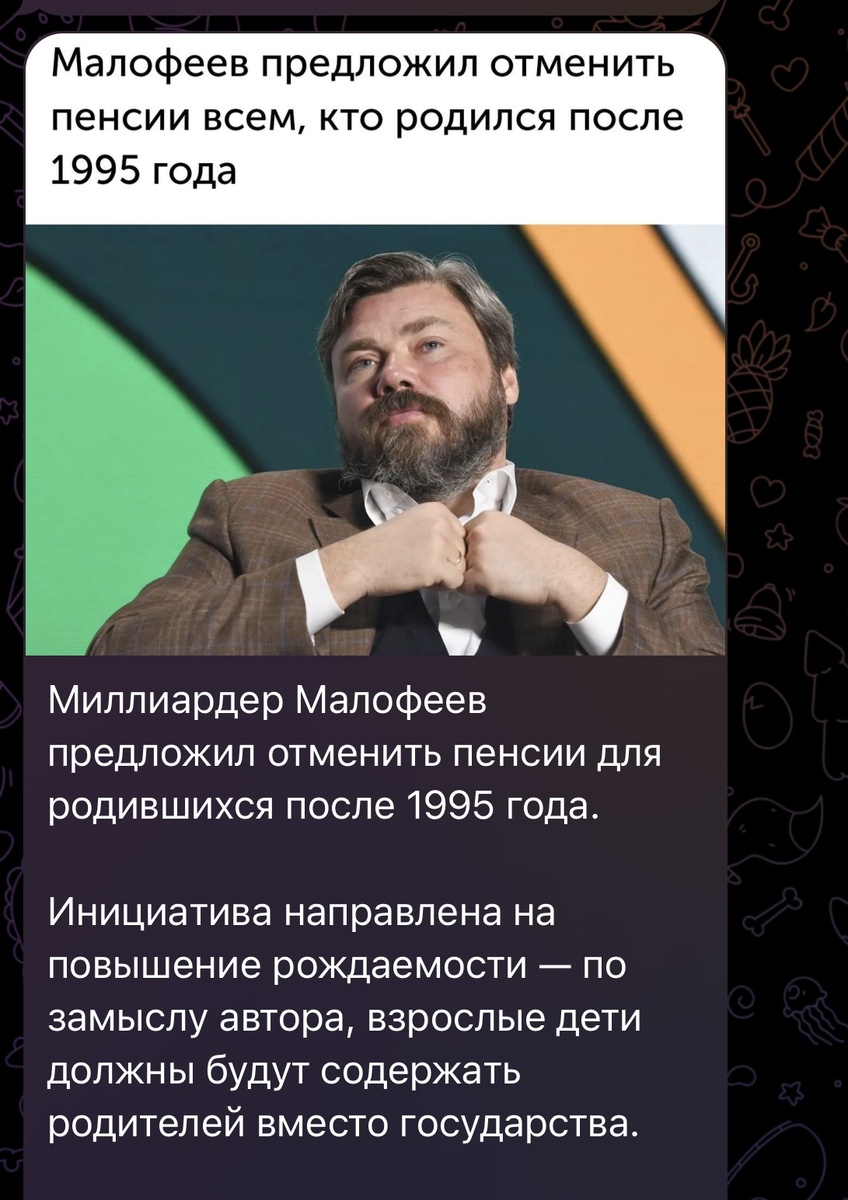 Малофеев предложил отменить пенсии всем, кто родился после 1995 года Миллиардер Малофеев предложил отменить пенсии для родившихся после 1995 года. Инициатива направлена на повышение рождаемости - по замыслу автора, взрослые дети должны будут содержать родителей вместо государства. (С) Потрясающее заявление, с учетом всех налогов, финансовых сложностей и тд. Давайте нарисуем картинку! Дети перестройки которые были многого лишены и жили в голоде родили новое поколение. Кто-то получился более менее здоровым, а кто-то инвалидном с рождения. Кто-то бездетный не из-за прихоти, а того что здоровья нет. Трудное детство, экология, стрессы и множества других негативных факторов. Люди которые не виноваты. И тут такие заявление давайте сделаем так! Давайте: 1. Вероятнее всего семьи без детей будут платить налог на бездетность (ведь все чаще о принятии его говорят) Так наверное с этих денег люди если доживут то, получат пенсию или как? Если в семье один может, а другой не сможет родить? К