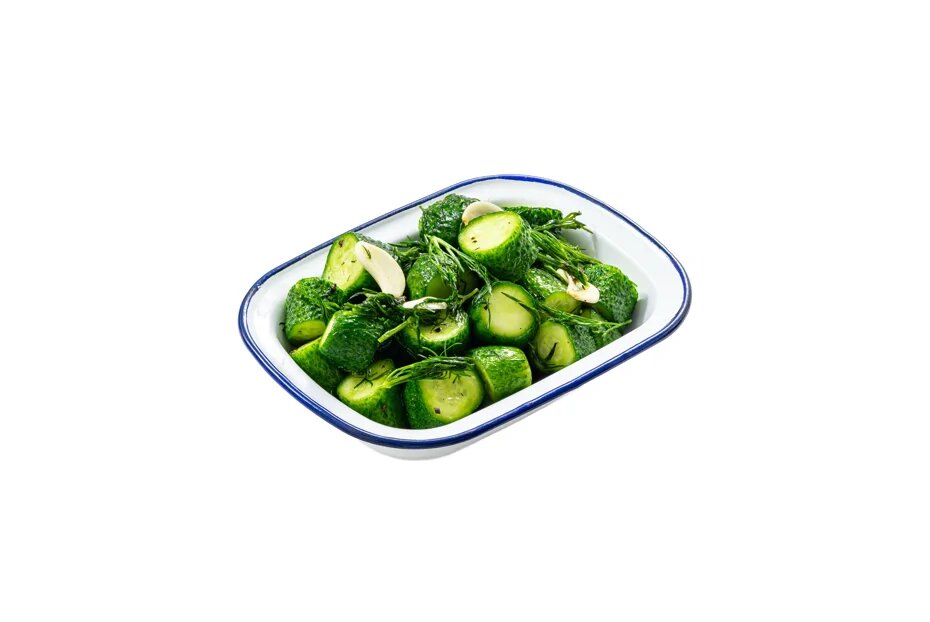 7.В контейнер с плотно закрывающейся крышкой выложить огурцы, чеснок и укроп.