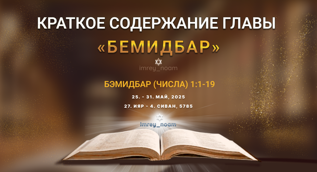 КРАТКОЕ СОДЕРЖАНИЕ ГЛАВЫ "БЕМИДБАР" Бэмидбар (Числа) 1:1 - 4:20 В синайской пустыне Б-г повелевает произвести исчисление двенадцати Колен Израилевых. В результате совершенной Моше переписи насчитывается 603550 мужчин возраста воинской службы ( от 20 до 60). Колено Леви исчисляется отдельно и насчитывает 22000 человек мужского пола в возрасте от 1 месяца и старше. Левиты должны служить в Храме вместо первенцев, чья численность была примерно той же самой, которые стали непригодны для священнослужения из-за поклонения Золотому Тельцу. 273 первенца (составлявших разницу между числом первенцев и левитов) должны были внести выкуп в количестве пяти шекелей. Когда во время странствий по пустыне евреи отправлялись в путь, левиты разбирали и несли Святилище и на следующей стоянке собирали его в центре лагеря. Затем они возводили собственные шатры вокруг него: семейство Кеата, чьей обязанностью было переносить на плечах храмовую утварь (Ковчег, Менора и т.д.), располагались к югу от Святилища; ле