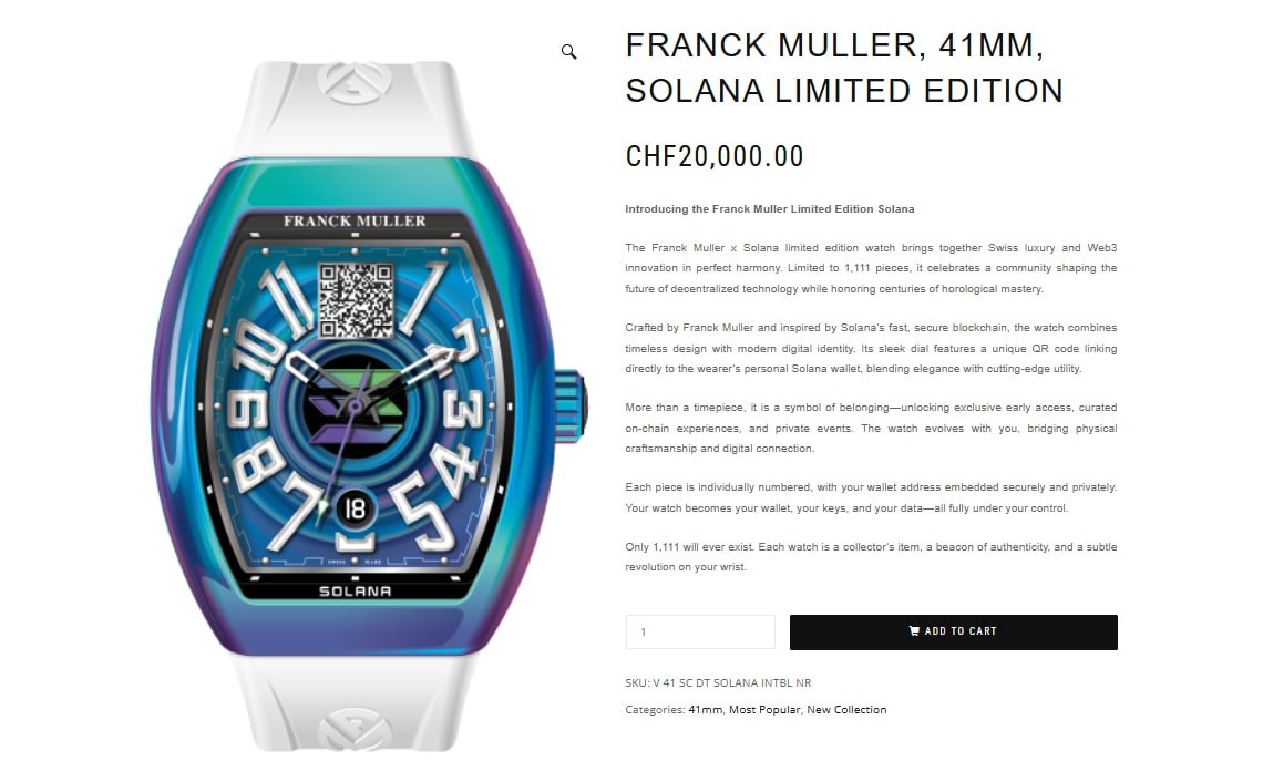 Швейцарский производитель Franck Muller представил лимитированную коллекцию часов FRANCK MULLER 41MM SOLANA LIMITED EDITION Выпущено всего 1111 экземпляров — каждый из них содержит встроенный QR-код, который напрямую ссылается на адрес Solana владельца. Стоимость одного экземпляра — 20 000 швейцарских франков (~ $24 300). 🔵 Наши ссылки 💰 Торгуем на Bybit | ✖️ Торгуем на BingX | ⚡️ Pro Energy