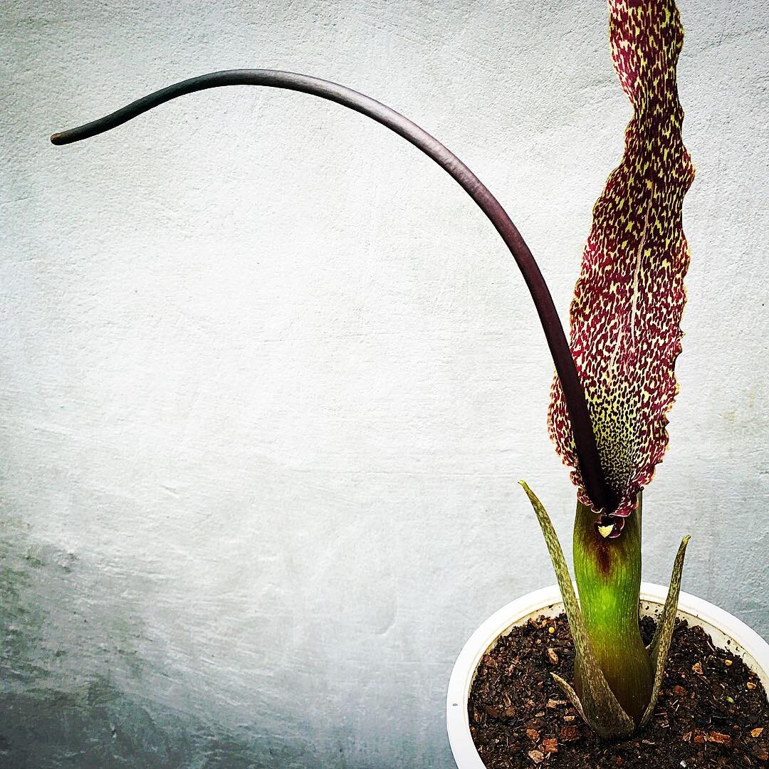 🌸🌿 Сауроматум (лилия Вуду, шаманская лилия) - необычное растение семейства ароидных. Имеет период зимнего покоя, после чего цветет оригинальными соцветиями (при условии что клубень достаточно сильный для цветения), характерными для ароидных. Цветение нельзя назвать главной фишкой. Все же основная ценность - красивый, крупный, глубоко разрезанный, пальчатый лист. Соцветие имеет неприятный аромат. Но это ненадолго, потому что быстро увядает. Если вообще хочется избежать цветения, то цветонос можно срезать сразу после появления. Это никак не отразится на появление будущего резного листа.
