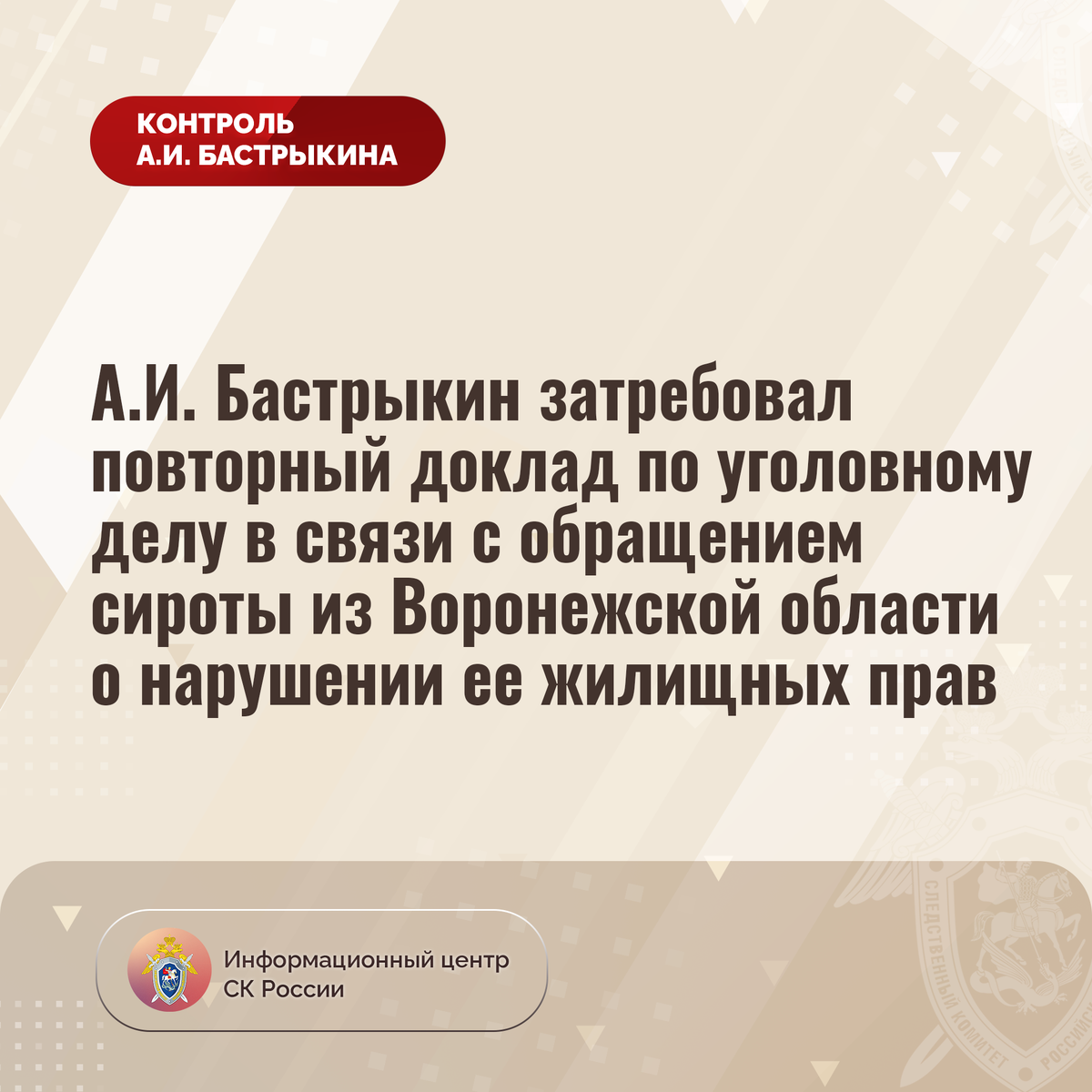 А.И. Бастрыкин затребовал повторный доклад по уголовному делу в связи с обращением сироты из Воронежской области