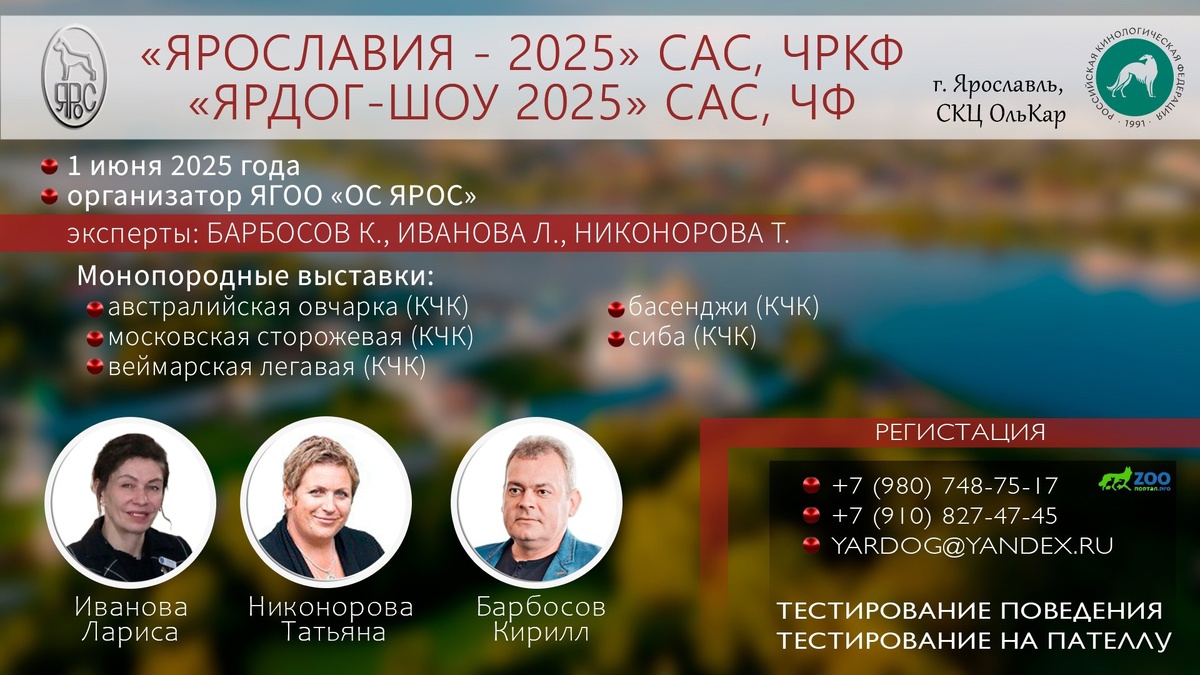 ⏰ 1 июн (7д) 🏛 #Ярославль #Россия #Выставка 🐶 Выставка собак: ЯРОСЛАВИЯ - 2025 🏆 Общество собаководов "Ярос" Контакты организаторов здесь: 🌐 https://www.petsman.ru/vystavki-sobak.php?mesto=109-yaroslavl «ЯРОСЛАВИЯ - 2025» ранга САС, Чемпион РКФ «Ярдог-Шоу - 2025» ранга САС, ЧФ Моно: Австралийская овчарка (КЧК) Московская сторожевая (КЧК) Сиба (КЧК) Басенджи (КЧК) Веймаранер (КЧК) В день мероприятий также можно пройти: Тестирование поведения собак Тестирование пателлы 🧑 👨 Эксперты: 🔹 Никонорова Т. (Москва) 🔹 Иванова Л. В. (Москва)