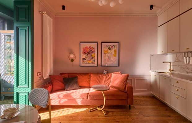 Розовая квартира мечты для молодой бизнес-леди Как дизайнер воплотила смелый запрос заказчицы: «Хочу розовую квартиру»? Узнайте в нашем новом румтуре! Герои румтура: дизайнер Екатерина Куликова и хозяйка квартиры — финансист Мария Банникова. Кратко о квартире: квартира находится в московской новостройке в районе Северное Тушино. Мария проживает в ней вместе с кошкой Стешей. На начало проекта это была квартира с открытой планировкой и черновой отделкой. В планировку внесли небольшие коррективы: присоединили лоджию, вход в спальню перенесли из коридора в гостиную, часть спальни отдали под гардеробную, немного увеличили санузел за счет площади прихожей. На первой же встрече с дизайнером хозяйка озвучила свое пожелание: она хотела, чтобы квартира была розовой. К этому цвету были подобраны компаньоны — глубокий синий и насыщенный зеленый, а также добавлены золотистые акценты. Оцените идеи по обустройству кухни — хозяйка любит готовить, поэтому функционал тщательно продуман. А поскольку кухн