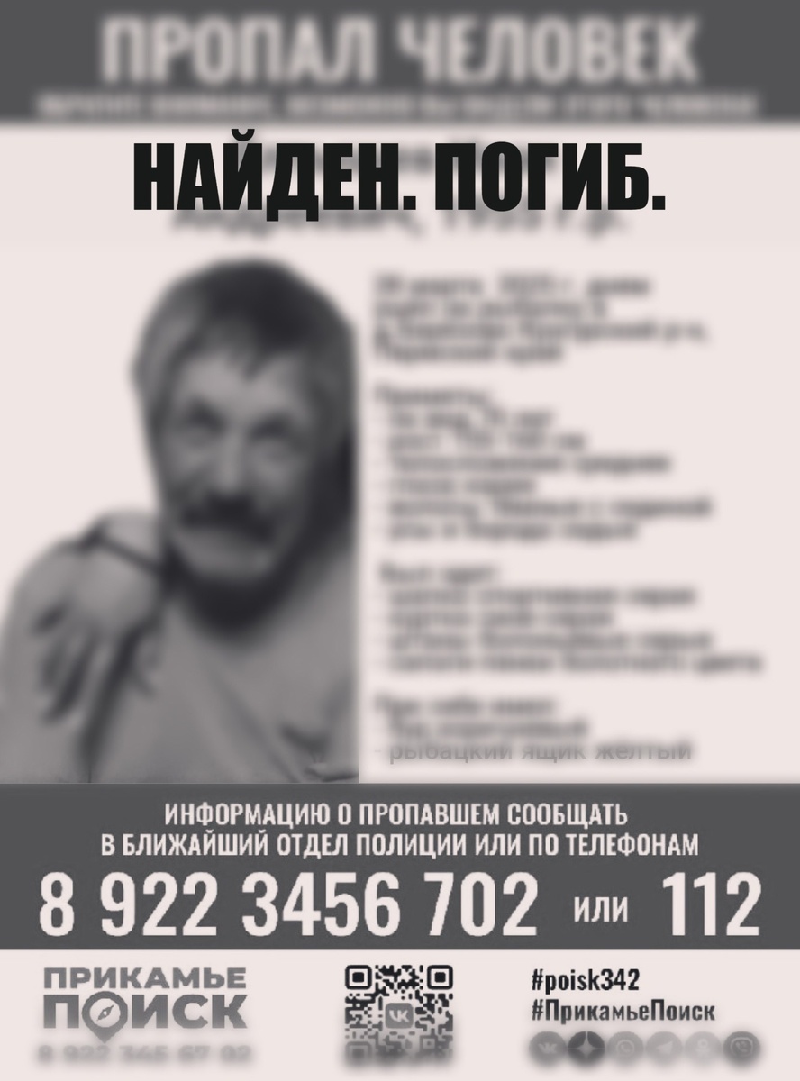 UPD: НАЙДЕН. ПОГИБ. ЁЛТЫШЕВ ИВАН АНДРЕЕВИЧ, 1955 г.р. Всем спасибо за помощь. Просьба снять репосты. ПРИНОСИМ СВОИ СОБОЛЕЗНОВАНИЯ РОДНЫМ И БЛИЗКИМ. #ПрикамьеПоиск #poisk342