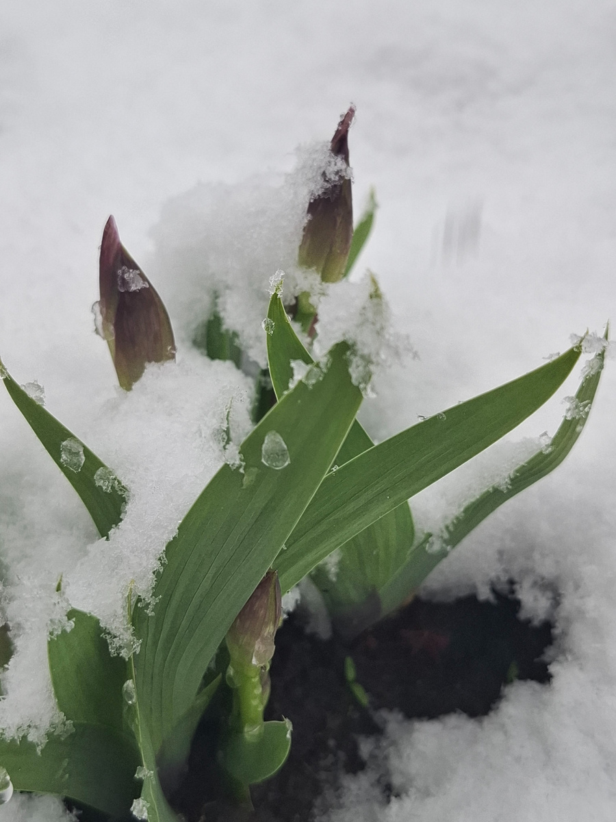 Приветствую читающих. Взбрыкнула погода буквально на одни сутки. Снег сыпал с утра и до трех часов ночи. Днем была такая необычная красота. Ирисы превратились в подснежники. Когда еще такое увидеть можно, бывает конечно, но очень редко. Тем более минусовой температуры не было. Все было покрыто толстым слоем снега, мокрого. Бадан не выдержал нагрузки, согнулся под тяжестью. Деревья тоже ветки повесили, у старых деревьев обломало несколько ветвей. Необычное сочетание ярко белого и ярко зеленого. Высадила бархатцы, думала уже все не будет непогоды, пришлось действовать таким способом. Утром проверку сохранности цветочков начала именно с банок. Уже снег начал таять, с верхушек банок исчез и около укрытия тоже земля видна. Это было в 7-30. К 9-00 уже ветки отряхнулись от груза снега потянули свои ветки ввысь.Небо голубое и солнце яркое. Перенесли бархатцы необычное природное явление под стеклом . А к 15-00 уже снег растаял, цветы приободрились, зазеленели еще ярче. Сутки разд